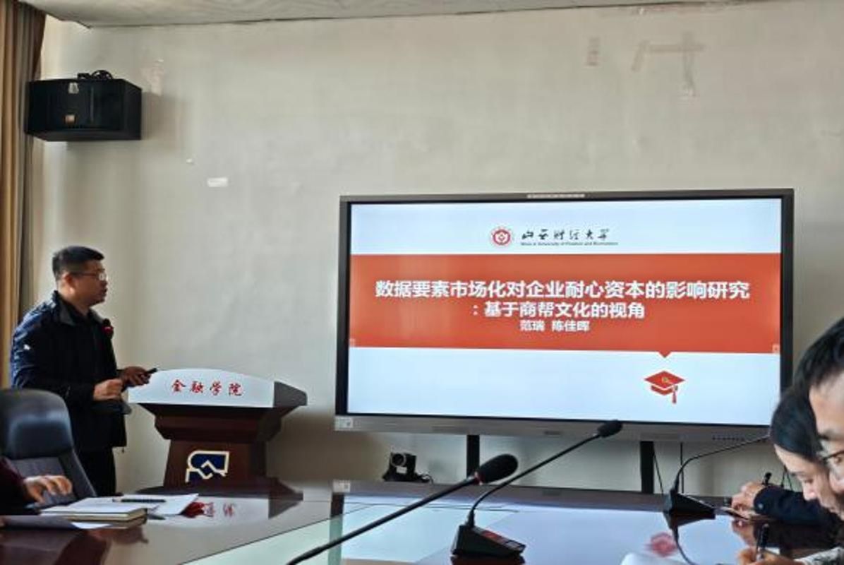 银行管理教研室范瑞老师进行了“数据要素市场化对企业耐心资本的影响研究:基于商帮文化的视角”的主题学术报告。党的二十届四中全会指出,要加快高水平科技自立自强,引领发展新质生产力,长期的耐心资本是发展新质生产力的关键。当前我国已经形成了一定规模的耐心资本,但是相比于战略性新兴产业和未来产业的巨额需求,供给缺口仍然较大。探究关于耐心资本的影响因素及形成机制成为当前亟需破解的难题。报告中,范瑞老师介绍了数据要素市场化改革对耐心资本形成的影响机理,同时分享了以商帮文化为代表的“软”制度在这一过程中的协同效应,为破解耐心资本供给缺口问题提供了经验证据。
