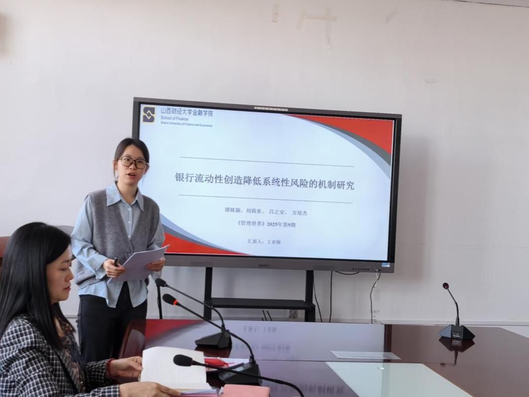本次论坛主讲人为金融理论教研室王亚梅老师,她围绕《管理世界》2025年第9期刊发的《银行流动性创造降低系统性风险的机制研究》一文,进行了详实深入的文献汇报。